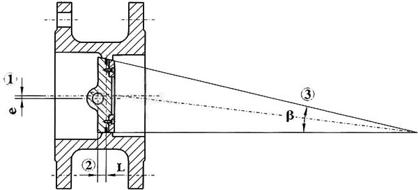 当阀门开启时,蝶板与阀座在关闭时瞬间接触,利用蝶板偏心1、偏心2迅速脱离阀座,降低了密封副的磨损,磨擦力矩小,开启灵活。偏心锥面3,使阀门在开启或关闭时蝶板能通过阀座内孔,实现接触密封。另外,锥形蝶板的旋转半径大于密封副接触位置的旋转半径,故蝶板在阀门关闭时将出现越关越紧,能够实现自锁,防止蝶板过位。